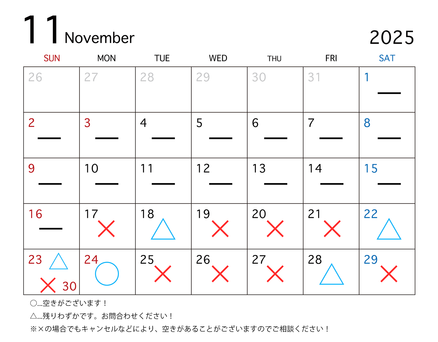 11月後半スタジオ空き状況